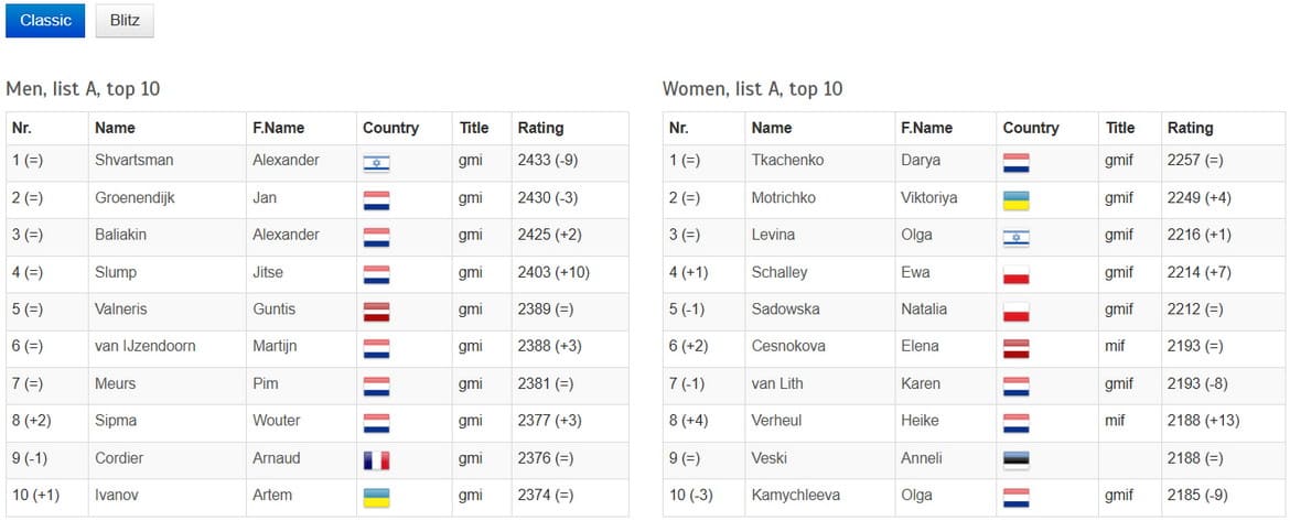 Згідно рейтингового листа Всесвітньої федерації шашок станом на 1 квітня 2026 року, Вікторія посідає 2-е місце в ТОП-10 найтитулованіших спортсменів світу з класичних шашок та 3-є місце у бліці. Також у двох РЛ і франківець Артем Іванов, який посідає відповідно 10-ту та 9-ту позиції. Харків’янин Юрій Анікєєв – топ-4 серед світових бліцерів.