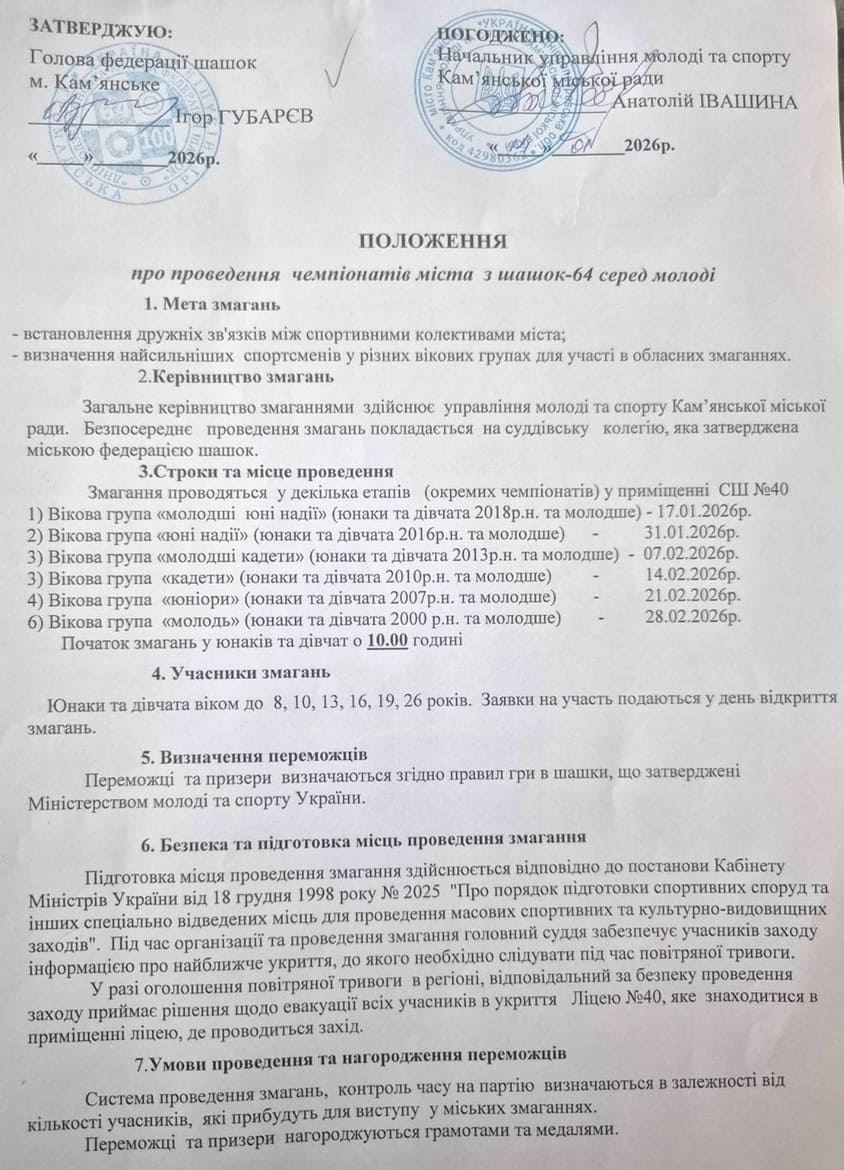 16 січня 2026року розпочався цикл чемпіонатів міста Кам'янське з шашок-64. Протягом двох місяців пройде 6 турнірів як серед дорослих спортсменів так і серед молоді.