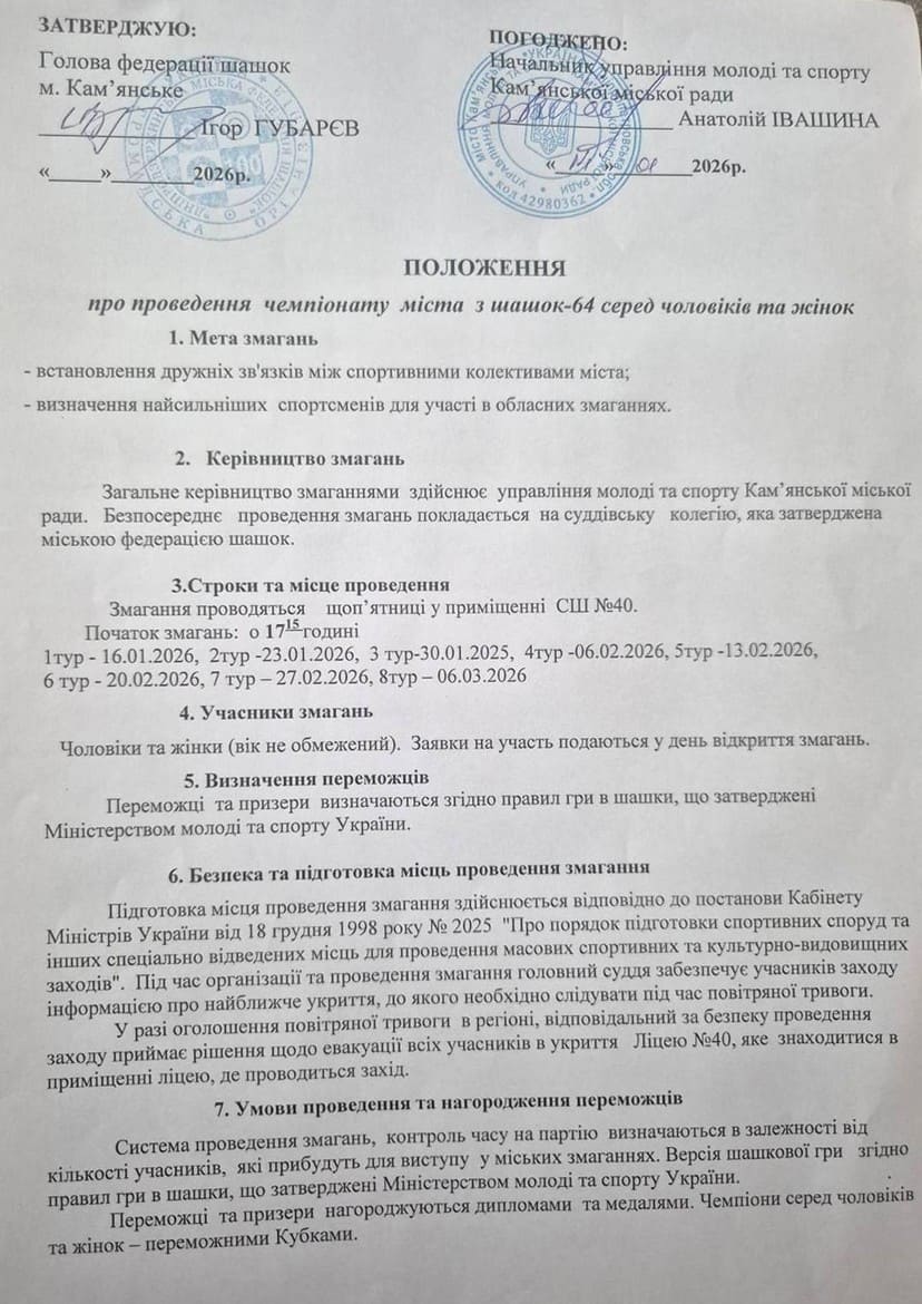 З 16 січня по 6 березня 2026року відбудеться чемпіонат міста Кам'янське з шашок-64 серед чоловіків та жінок, в якому беруть участь 24 спортсменів (15 чоловіків та 9 жінок). Серед учасників – гросмейстерка, 2 майстри спорту, 7 кандидатів у майстри спорту та 14 першорозрядників.