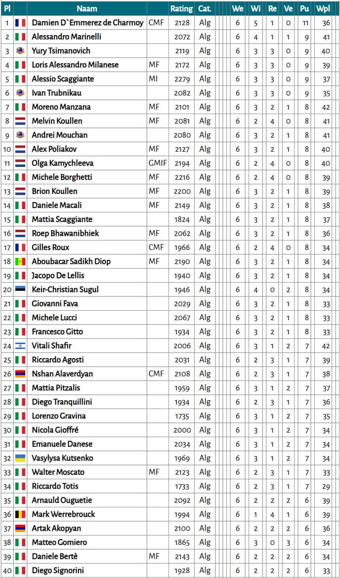 Переможцем турніру став Damien D'Emmerez de Charmoy (Франція), який продемонстрував упевнену гру, втративши лише одне очко та здобувши 5 перемог у 6 партіях.