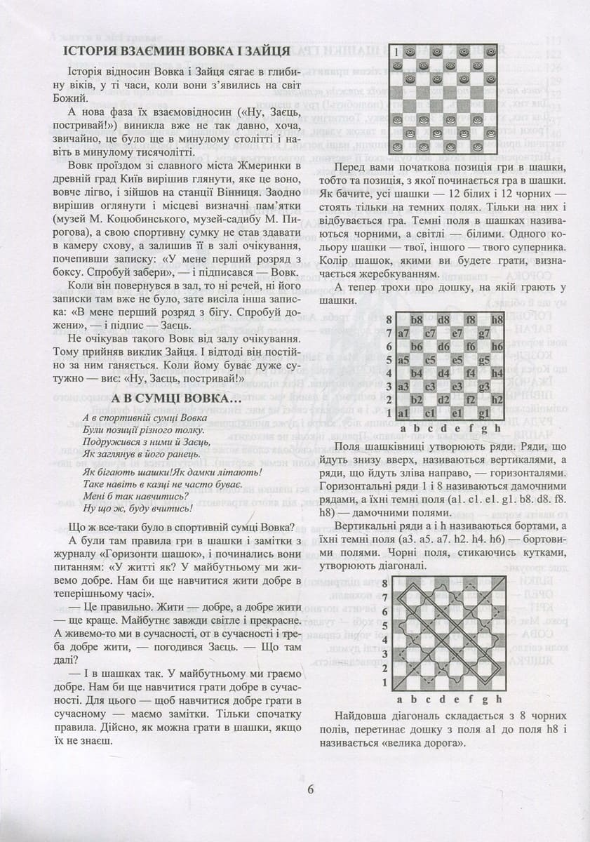 Шашки є одним із засобів розвитку в дитини багатьох важливих якостей: цілеспрямованості, концентрації, відповідальності за свої вчинки, інтуїції і. насамперед, пам’яті та логічного мислення. Казкова форма викладу навчального матеріалу є однією зі спроб залучення дітей до цієї древньої гри, яку грали ще єгипетські фараони. Посібник відповідає чинним програмам підготовки в спортивних установах і позашкільних закладах.
