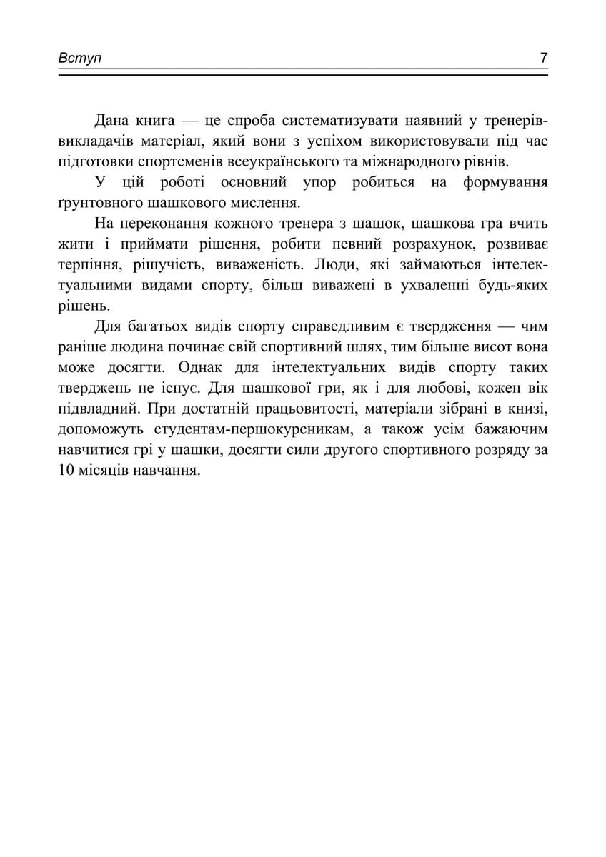 Посібник призначений для студентів вищих навчальних закладів І–ІVрівнів акредитації, а також може бути використаний при підготовці спортсменів-розрядників шашкових відділень дитячо-юнацьких спортивних шкіл.