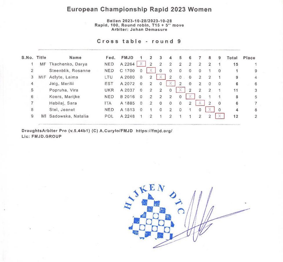 Норматив спортсменка КПНЗ «ДЮСШ №9 ім. міжнародного гросмейстера О.С.Мороза» (м.Дніпро) виконала на чемпіонаті Європи з шашок-100 серед жінок, що відбувся у Нідерландах (3 місце в турнірі з швидкої гри). Тренує спортсменку – ПАНЧЕНКО Анатолій Анатолійович (м.Дніпро). Перший тренер – САВІНСЬКИЙ Дмитро Олександрович (м.Кам'янське).