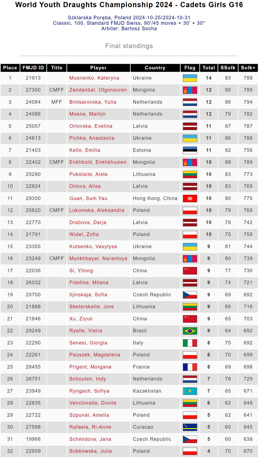 На 01.04.2025 Катерина Мусієнко має 3-й міжнародний рейтинг серед усіх жінок України.