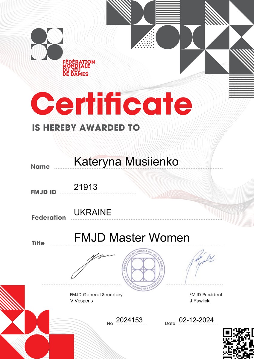 Спортсменка КЗ МКДЮСШ «Восток» на чемпіонаті світу з шашок-100 серед молоді (вікова група «кадетки»), що відбувся у Польщі, посіла 1місце в турнірі з класичної гри, виконавши міжнародний норматив. Отримавши звання «Master FMJD women» (майстер FMJD серед жінок) відповідно до рішення Всесвітньої федерації шашок FMJD від 02.02.2024 року, Катерина Мусієнко виконала кваліфікаційний норматив Єдиної спортивної класифікації України з неолімпійських видів спорту. Тренує спортсменку– ШАПУНОВ Олег Якович та КАСЬЯН Марина Ігорівна (м.Харків).