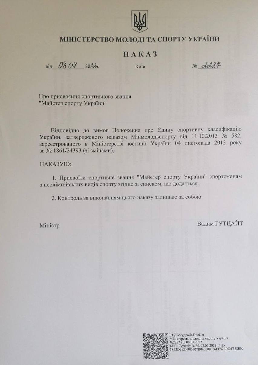 Хаос, який панував в українських міністрерських колах після 24 лютого 2022 року, дуже довго був перепоною у вирішені питання. Кому надсилати оновлену таблицю, хто займається присвоєннями? Тоді всім було не до того. Тим не менш, згодом таблицю було оновлено та повторно надіслано у Міністрество. І ось нарешті, довгоочікуване присвоєння звання «майстра спорта України».