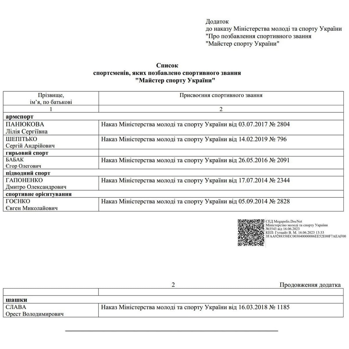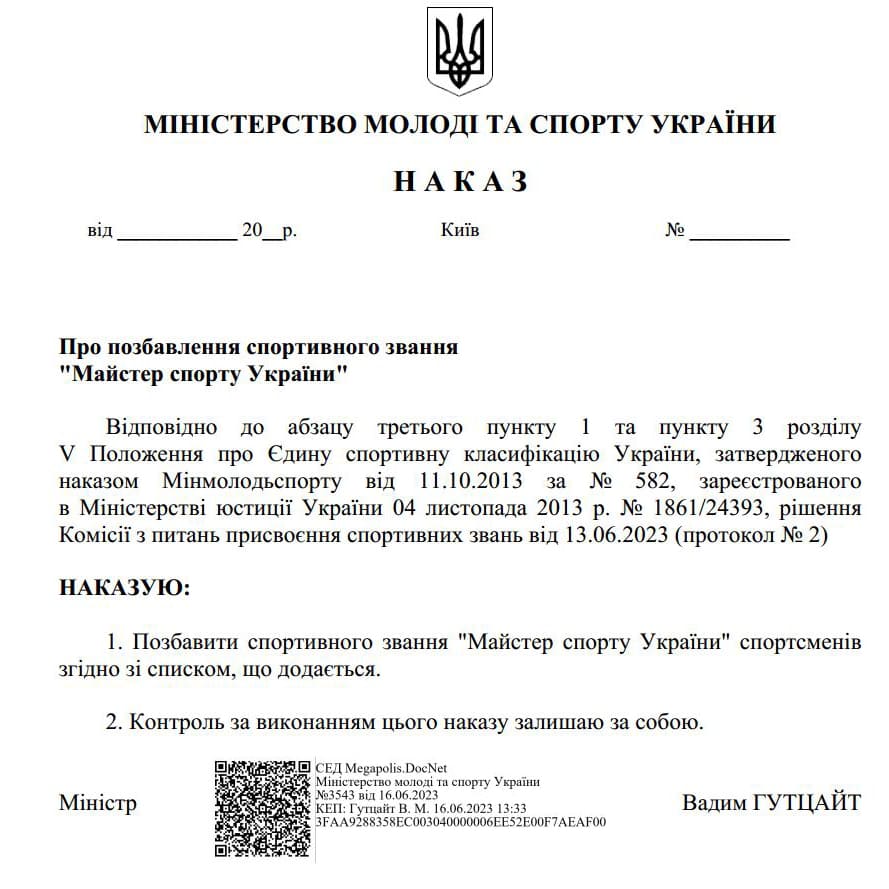 ФранкЦе відбулося відповідно до Наказу №3543 від 16.06.2023 року Міністерства молоді та спорту України. Звання «Майстер спорту України» позбавлено спортсмена Франківщини СЛАВА Орест Володимирович.
