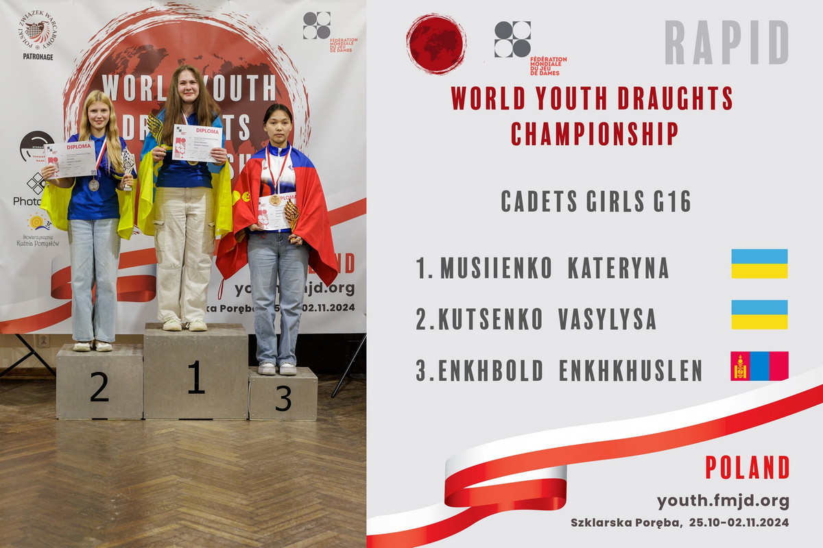 Дуже потужно виступила кандидатка у майстри спорту Катерина Мусієнко, яка стала абсолютною чемпіонкою світу серед «кадеток», тобто виграла «класику», «рапід» та «бліц»). Вдалий виступ спортсменки у групі G16 дозволяє їй розраховувати на підвищення в класі. Норматив Master FMJD, який виконала К.Мусієнко у класичній грі, прирівнюється згідно Кваліфікаційних норм та вимог Єдиної спортивної класифікації країни з неолімпійських видів спорту до виконання звання «Майстер спорту України» з шашок.