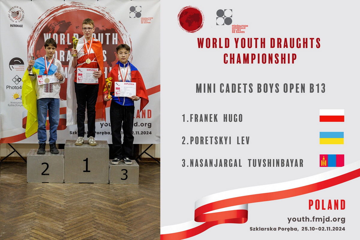 Восьму у загальному медальному заліку нагороду для України виборов киянин Лев Порецький. Наш юний кандидат у майстри спорту посів друге місце у віковій групі «молодші кадети» (B13), вчергове виконавши міжнародний норматив Candidate FMJD Master. Тренером юнака є відомий майстер своєї шашкової справи – Ростислав Лєщинський, який, нагадаємо, нещодавно як спортсмен виборов «срібло» чемпіонату світу серед ветеранів.