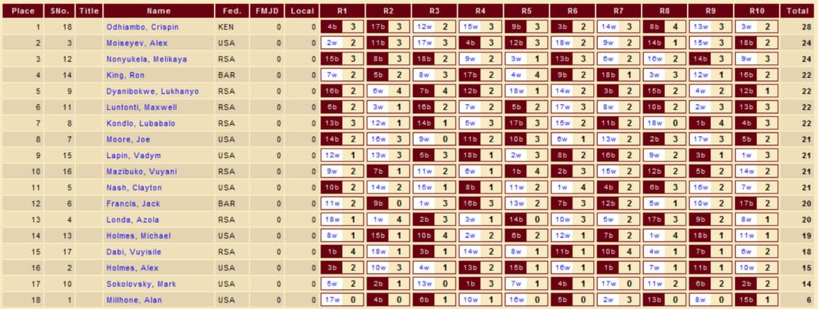 У всіх турнірах поза конкуренцією виявився Crispin Odhiambo з Кенії. У матчі ПАР – США з рахунком 83-81 перемогли гості з Південної Африки. Вадим Лапін набрав 21 очко у 10-х турах. Киянин розташувався всередині турнірної таблиці на 9-му місці.